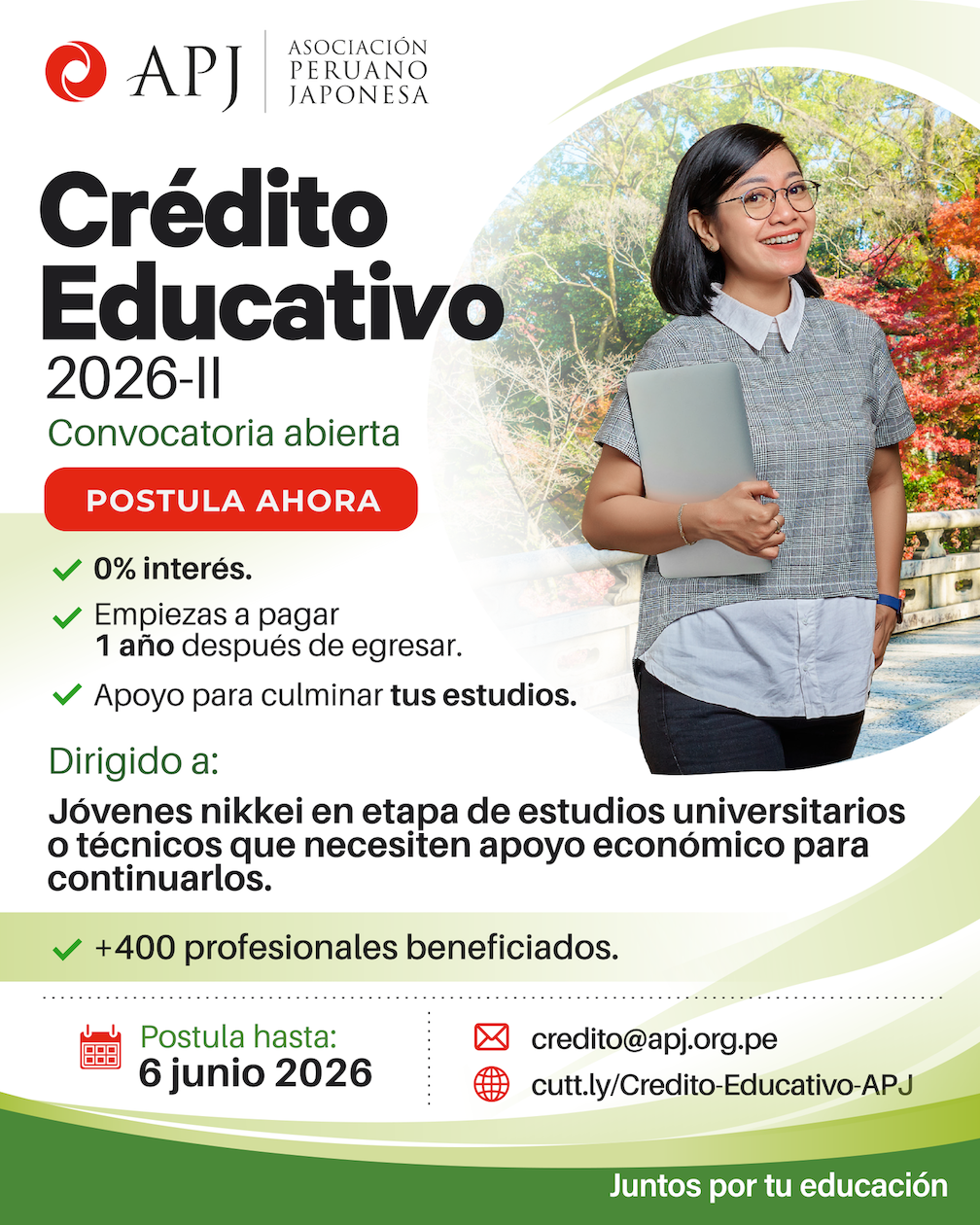 Con el propósito de seguir impulsando el acceso a la educación superior, la Asociación Peruano Japonesa (APJ) anuncia la apertura de una nueva convocatoria de su programa de Crédito Educativo, dirigida a estudiantes nikkei que cursen carreras universitarias y técnicas en instituciones licenciadas por la SUNEDU.
