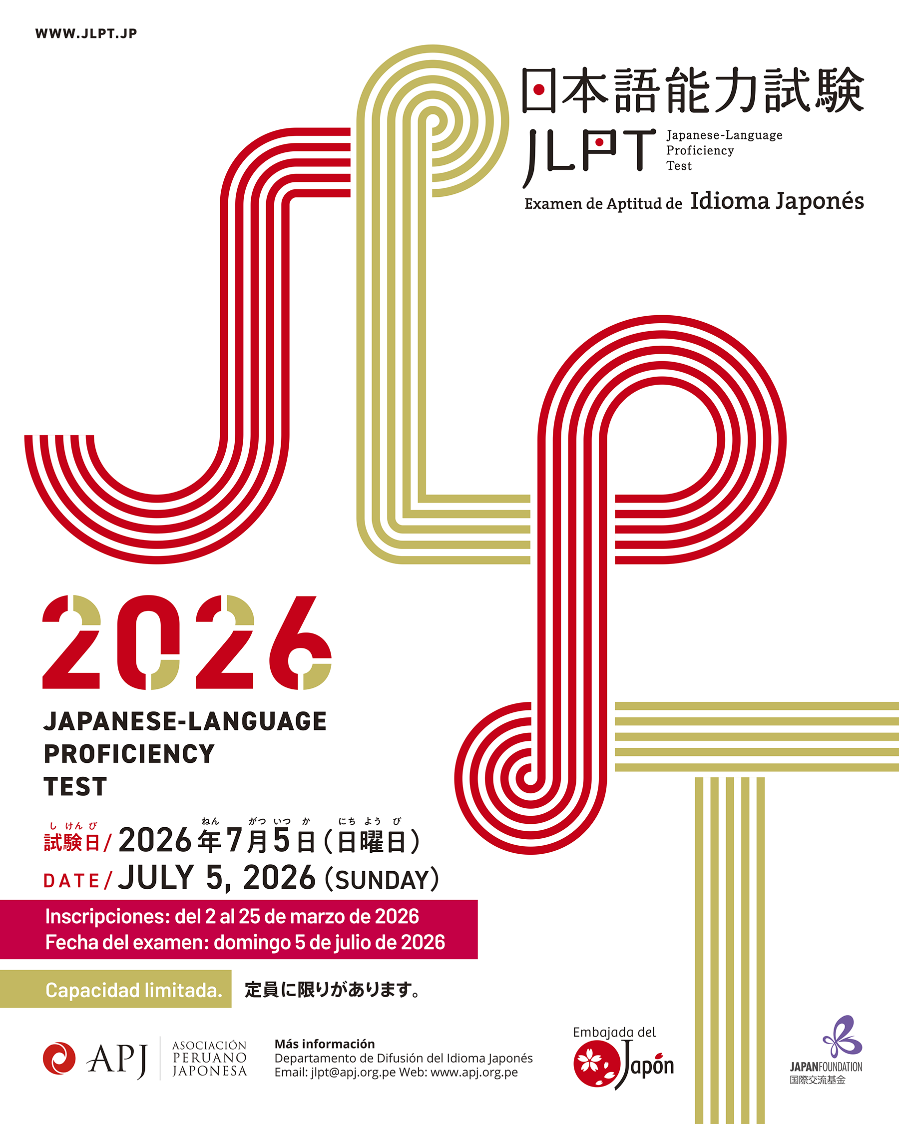Para ello, deberán enviar un correo electrónico a jlpt@apj.org.pe con el asunto “Solicitud de inscripción (nivel: N…)” según el nivel al que postulen. En el que mensaje deberán incluir su número telefónico.