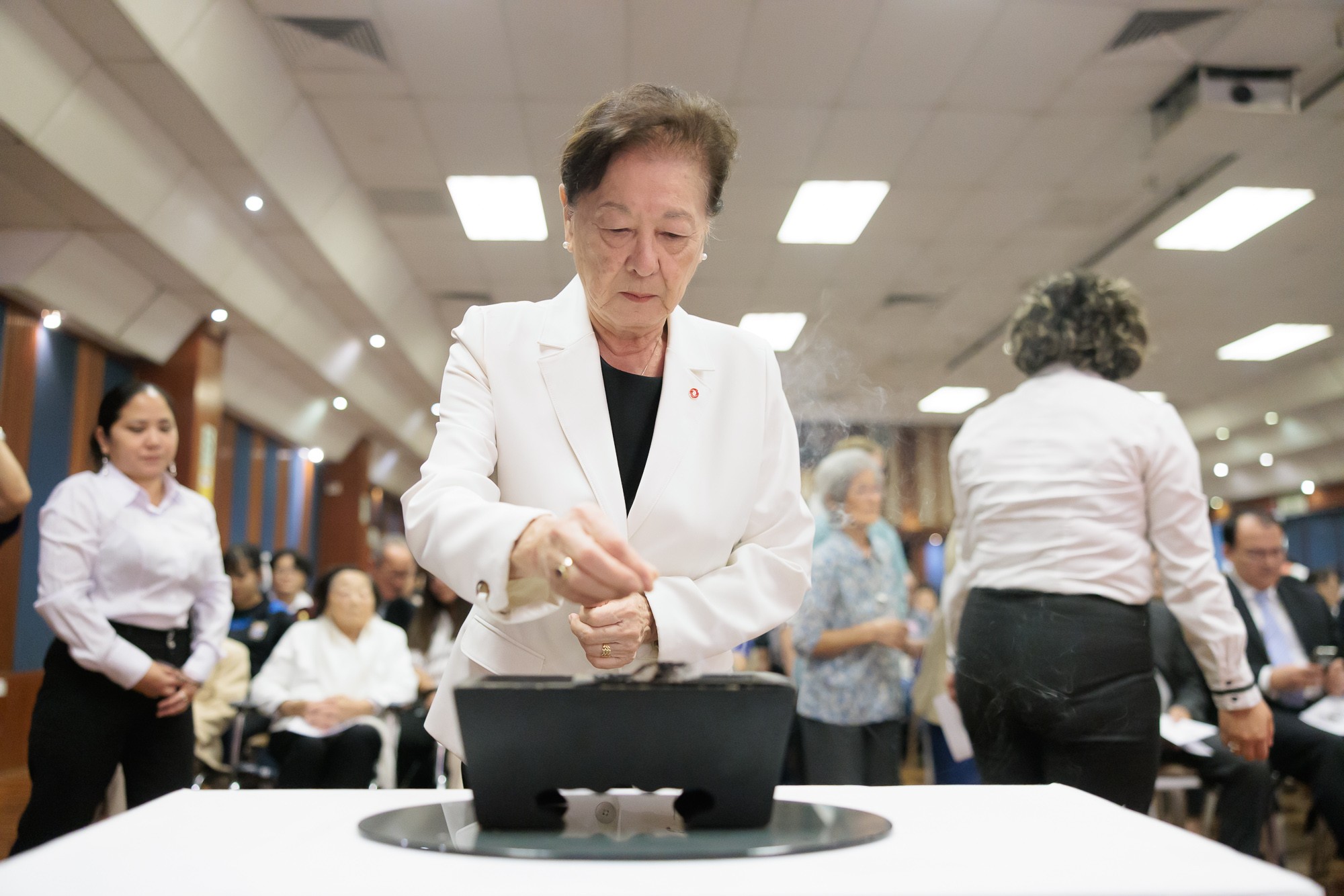 Los asistentes, entre quienes se encontraban representantes de instituciones nikkei y kōreisha del Centro Recreacional Ryoichi Jinnai, participaron en el oficio budista con el ofrecimiento del makkō (incienso) ante el altar budista.
