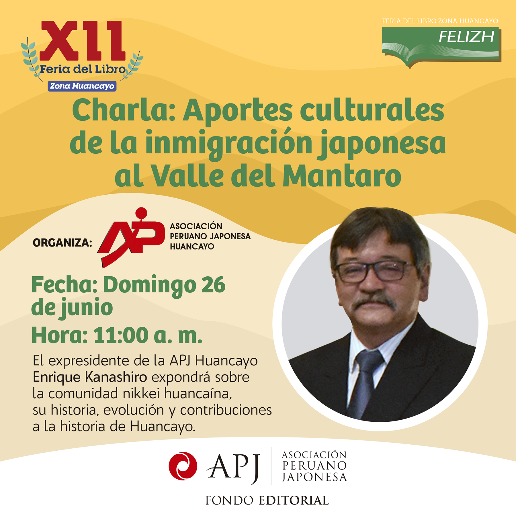 Con una propuesta que tiene por objetivo promover la literatura y cultura nikkei, el Fondo Editorial de la Asociación Peruano Japonesa (APJ), en cooperación con la Asociación Peruano Japonesa de Huancayo, participará de la XII Feria del Libro Zona Huancayo (XII FELIZH) del 17 al 30 de junio.