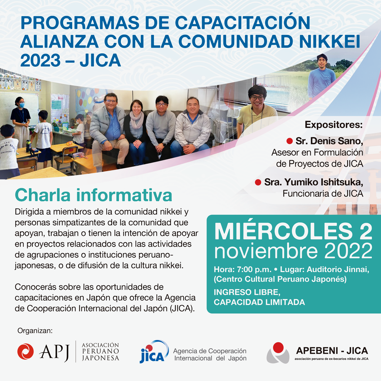 La Agencia de Cooperación Internacional del Japón (JICA) presentará esta charla informativa sobre los programas de capacitación 2023 dirigidos a miembros de la comunidad nikkei y a quienes trabajan o apoyan proyectos relacionados con instituciones de la comunidad peruano japonesa.