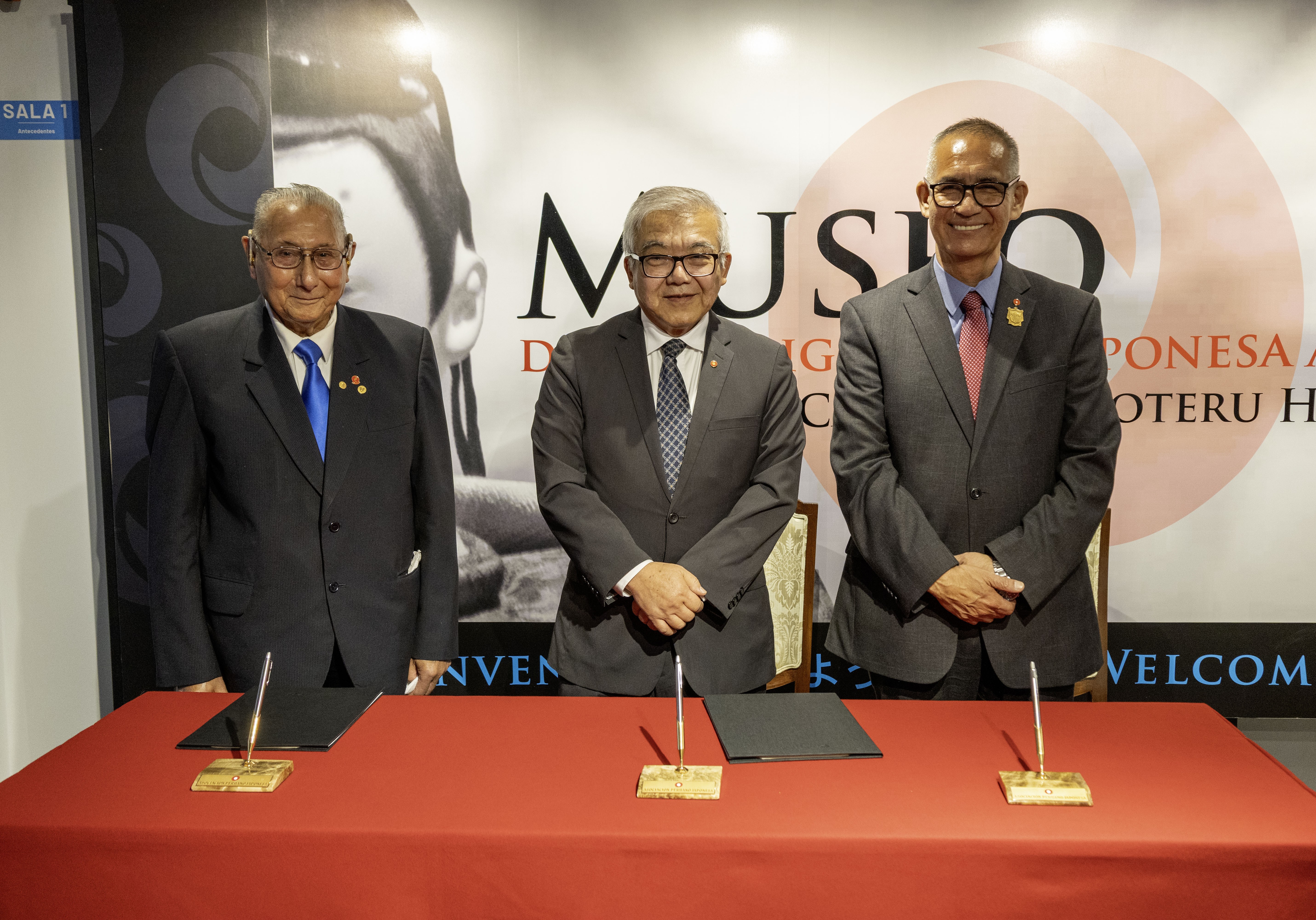 La suscripción del documento, a través del cual se formaliza la donación de 4,532 objetos, estuvo a cargo de Jorge Igei, presidente de la APJ; Fernando Suenaga, presidente de la Fundación Cultural Nikkei; y Fernando Lores, tesorero de la APJ.