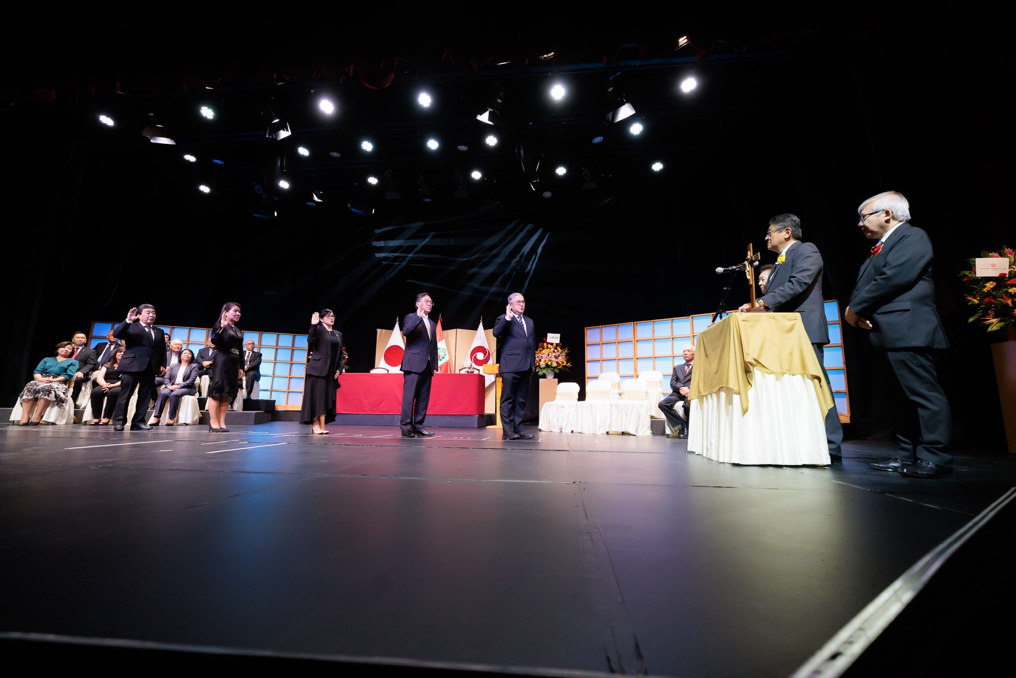 Luego de entonar el Himno Nacional del Perú y el Himno Nacional de Japón, la ceremonia continuó con las palabras del presidente saliente, Jorge Igei Ikehara, quien agradeció a todo el equipo que lo acompañó durante su periodo. Además de destacar los diversos proyectos emprendidos, señaló que “nos propusimos impregnar una cultura de okagesamade, en gratitud al legado de los inmigrantes japoneses y de todos quienes nos precedieron, cuyas enseñanzas nos han inspirado a trabajar con esfuerzo y asumir los desafíos de nuestra comunidad nikkei y de la sociedad, las cuales nos han permitido lograr lo que somos y lo que logramos”, dijo.
