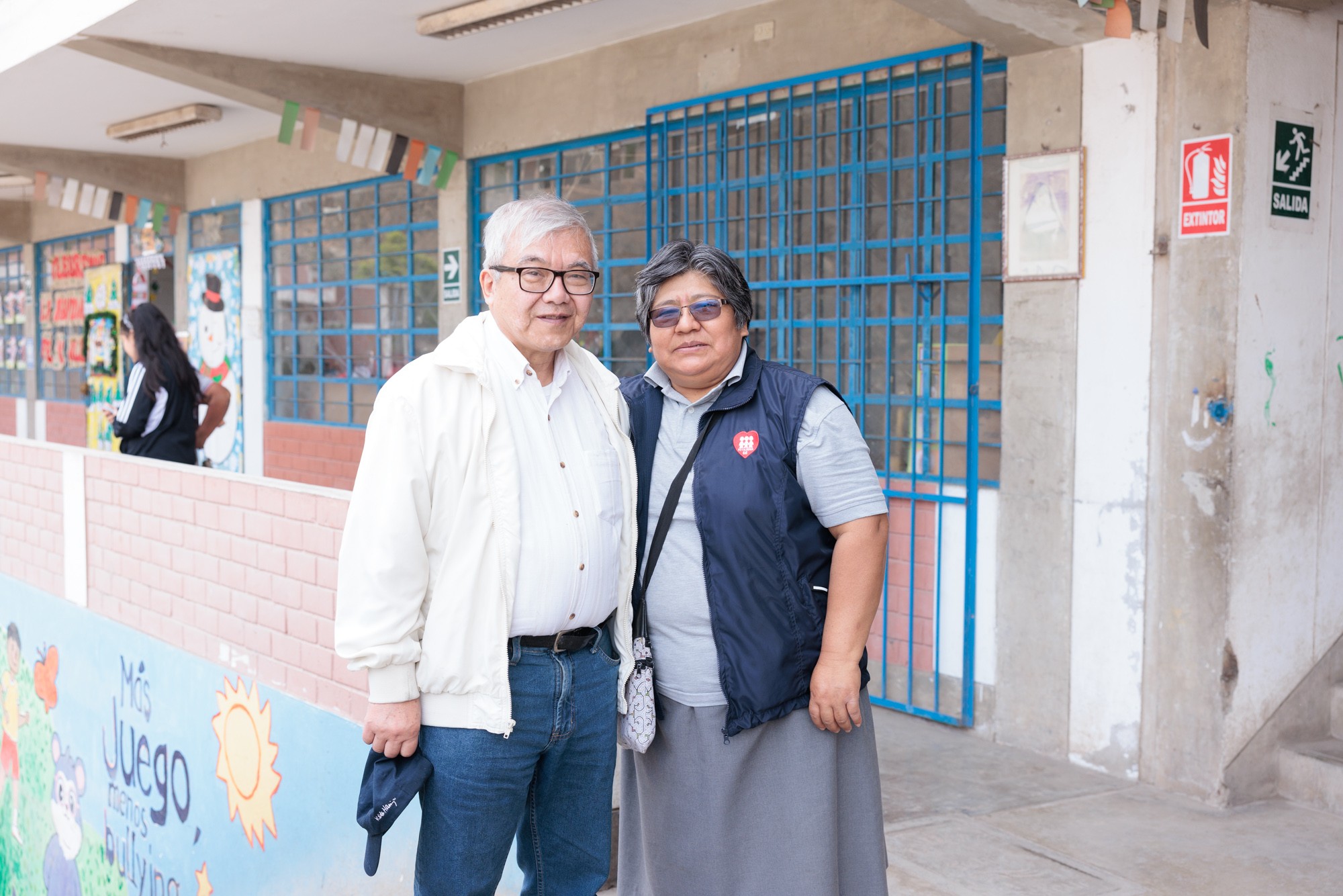 Jorge Igei, presidente de la APJ, junto a Hermana Aide Yucra, promotora del Colegio Fe y Alegría 65.