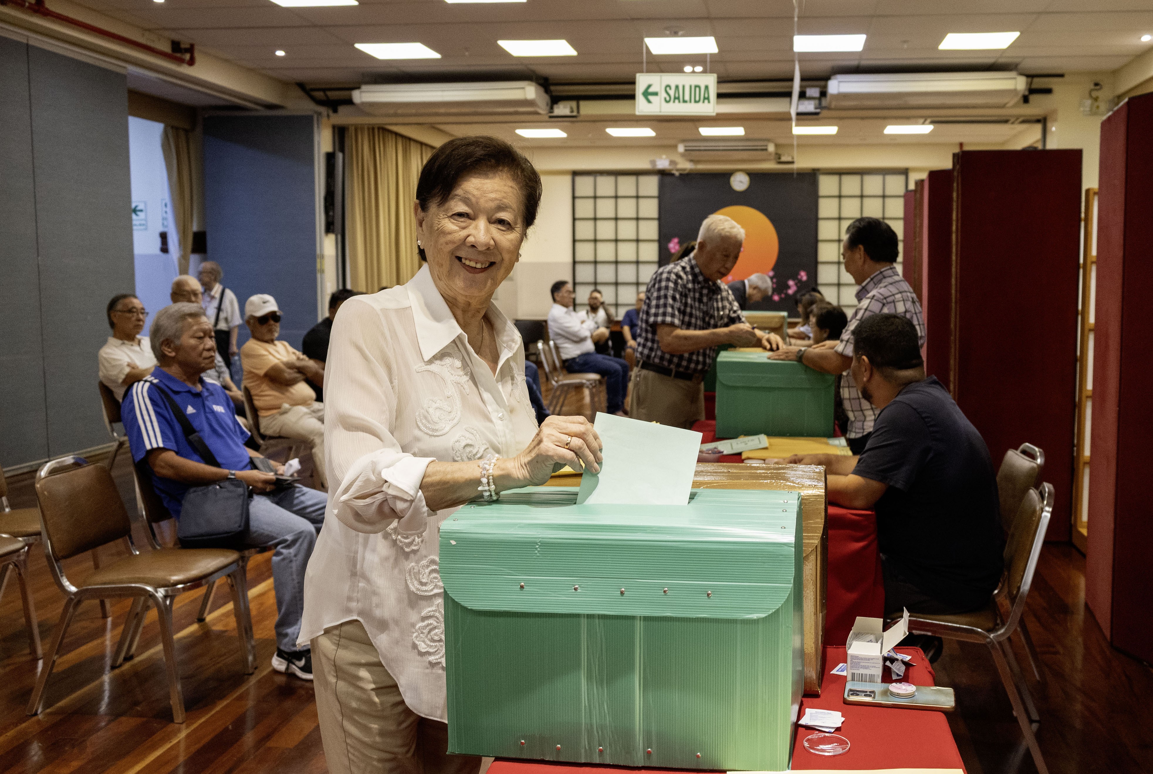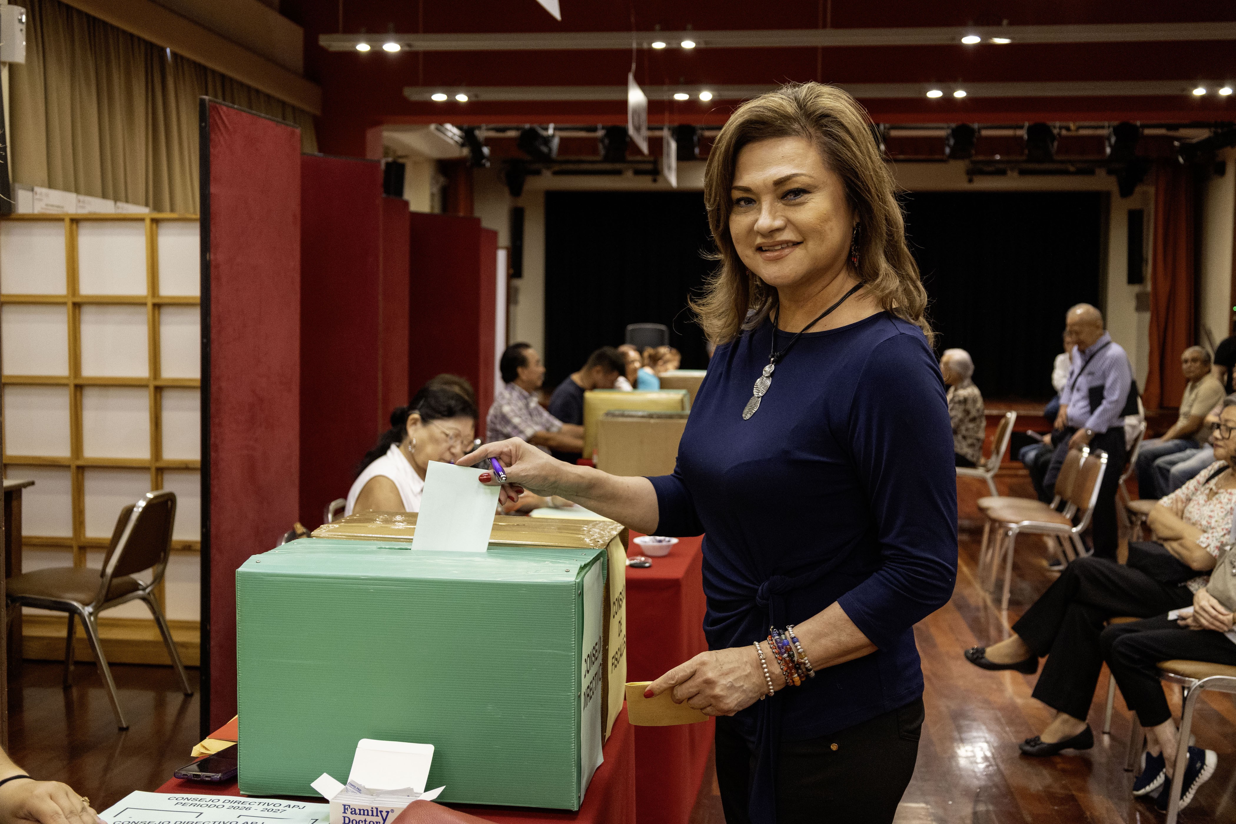 María Luisa Kohatsu y Rosa Arashiro de Nakamatsu, quienes encabezaron las listas 1 y 2 respectivamente, votaron en el auditorio Jinnai.